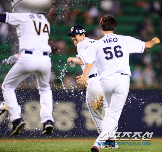 2015프로야구 두산과 한화의 경기가 30일 잠실 야구장에서 펼쳐 졌다. 두산 10회말 2사 만루에서 한화 투수 이동걸의 폭투를 틈타 결승 득점을 올린 김현수가 기뻐하고 있다. 잠실=조병관기자 rainmaker@sportschosun.com/2015.08.30/