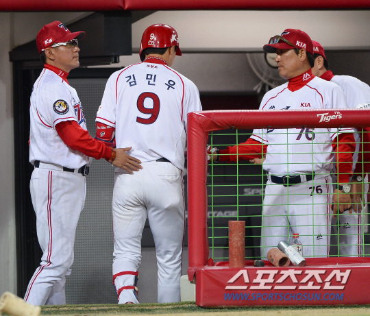 15일 광주기아챔피언스필드에서 KBO리그 KIA 타이거즈와 한화 이글스의 2연전 첫 번째 경기가 열렸다. KIA 김민우가 2회 1사 1,3루에서 1타점 희생플라이를 날렸다. 덕아웃에서 김기태 감독과 하이파이브를 나누고 있는 김민우. 광주=송정헌 기자 songs@sportschosun.com/2015.09.15