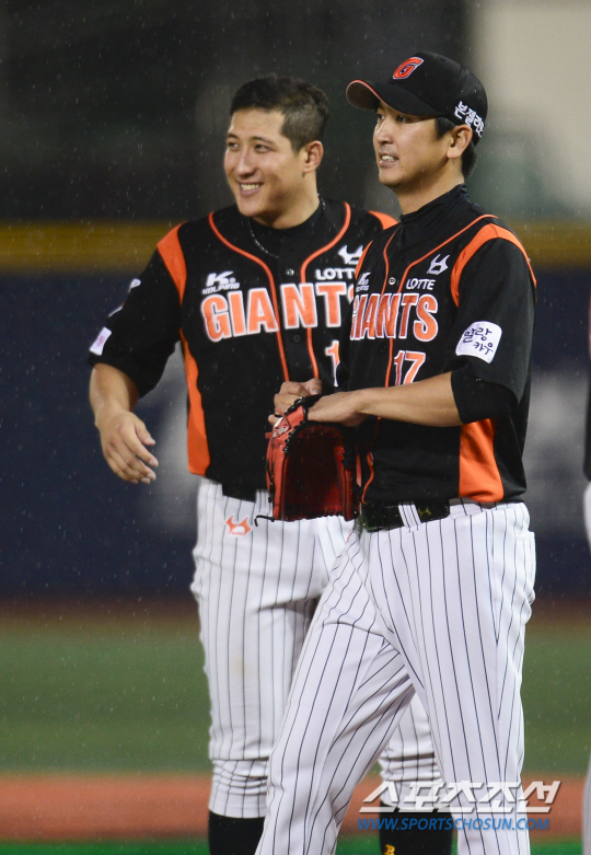 2015 프로야구 롯데 자이언츠와 넥센 히어로즈의 경기가 16일 목동구장에서 열렸다. 갑작스런 폭우로 1회말 경기 도중 중단된 경기가 결국 취소됐다. 롯데 선발투수 심수창과 황재균이 그라운드에 나와 팬들에게 인사를 하고 있다. 롯데는 선발투수로 3승 4패 방어율 5.64의 심수창을 내세웠다. 넥센에서는 1승 방어율 3.27의 금민철이 선발 등판했다. 목동=정재근 기자 cjg@sportschosun.com