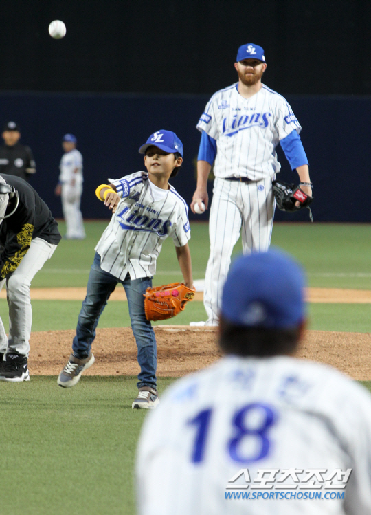 사연을 이렇다. 이날 박석민은 개인통산 1000경기 출전에 대해 KBO로부터 기념 트로피를 받게 돼 있었다. 아들인 준현군이 아버지의 수상을 축하하기 위해 시구를 자청했다.