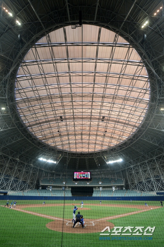 물론 고척돔에 박수쳐줄 만한 '거리'도 있다. 선수들의 안전을 최우선적으로 고려한 부분이다. 외야 안전펜스 두께는 메이저리그 규정인 7㎝보다 2배 이상 두꺼운 15㎝다. 운동장에는 메이저리그 그라운드키퍼의 자문을 받아 돔구장 전용 인조잔디와 메이저리그 전용 흙을 깔았다. 여기에 돔구장의 특성을 십분 살려 그물망을 철제 포스트에 거는 대신 천장에 매달았다. 철골 구조물이 없는 데다가 그물망 자체도 기존 3㎜가 아닌 1㎜ 두께의 고강도 섬유망을 써서 한결 시야가 좋다는 평이다. 고척=함태수 기자 hamts7@sportschosun.com