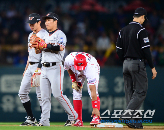 16일 광주기아챔피언스필드에서 KBO리그 KIA 타이거즈와 한화 이글스의 2연전 두 번째 경기가 열렸다. KIA 7말 2사 1,3루에서 신종길의 내야 땅볼 타구를 한화 권용관(왼쪽)의 포구 실책으로 동점을 허용했다. 아쉬운 표정을 짓고 있는 권용관과 정근우. 광주=송정헌 기자 songs@sportschosun.com/2015.09.16 |