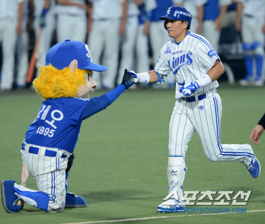 삼성과 NC의 2015 KBO 리그 주중 3연전 마지막 경기가 30일 대구구장에서 열렸다. 3회말 1사 삼성 이승엽이 NC 이민호의 투구를 받아쳐 중견수 뒤 담장을 넘어가는 솔로홈런을 날렸다. 홈인하며 기쁨을 나누는 이승엽. 대구=허상욱 기자 wook@sportschosun.com/2015.07.30/ |