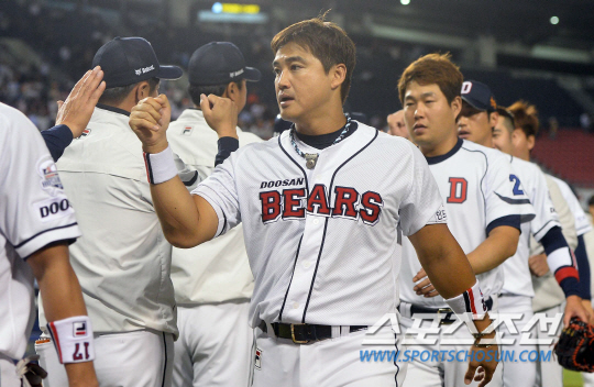 2015 KBO리그 두산 베어스와 롯데 자이언츠의 경기가 17일 서울 잠실야구장에서 열렸다. 홍성흔이 팀의 13대 0승리를 확정짓고 동료들과 기쁨의 하이파이브를 하고있다. 잠실=최문영 기자 deer@sportschosun.com /2015.09.17/ |