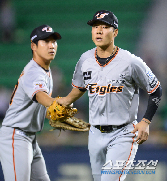 | 2015 KBO리그 LG트윈스와 한화이글스의 경기가 8일 서울 잠실야구장에서 열렸다. 한화 1루수 권용관이 9회말 2사 2,3루 히메네스 타석때 3루수 주현상과 포지션을 바꾸고 있다. 잠실=최문영 기자 deer@sportschosun.com /2015.09.08/ |
