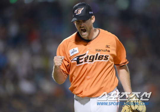 19일 대전 한화생명이글스파크에서 KBO리그 한화 이글스와 두산 베어스의 주말 2연전 첫 번째 경기가 열렸다. 두 팀 모두 최근 10경기 2승 8패로 부진한 성적을 기록 중이다. 한화 선발 탈보트가 6회 1사 1, 3루에서 홍성흔을 병살처리하며 무실점으로 이닝을 마쳤다. 주먹을 불끈 쥐어보이고 있는 탈보트. 대전=송정헌 기자 songs@sportschosun.com/2015.09.19