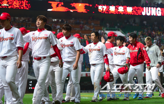 2015 프로야구 KIA 타이거즈와 SK 와이번스의 경기가 19일 인천 SK행복드림구장에서 열렸다. 8-4로 승리를 거둔 SK 선수들이 승리를 자축하고 있다. KIA는 선발투수로 시즌성적 1승 2패 방어율 6.99의 임기준을 내세웠다. SK에서는 7승 10패 방어율 4.41의 켈리가 선발 등판했다. 인천=정재근 기자 cjg@sportschosun.com/2015.09.19/