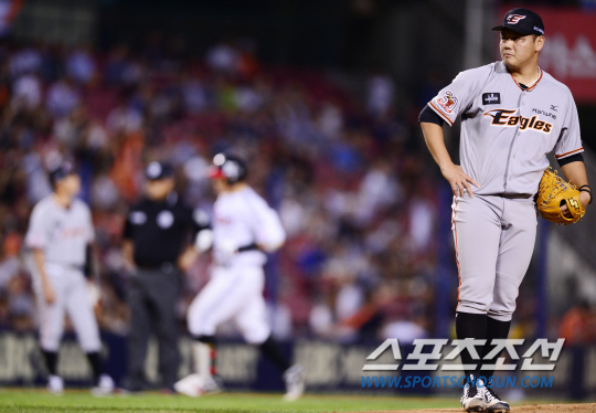 한화 송창식이 지난 9일 LG전에서 2회 LG 유강남에게 솔로 홈런을 허용하고 아쉬워 하고 있다. 송창식은 곧바로 강판됐다. 송창식은 피홈런 갯수와 이닝 등을 종합할 때 피홈런 체감지수가 가장 높다. 조병관기자 rainmaker@sportschosun.com