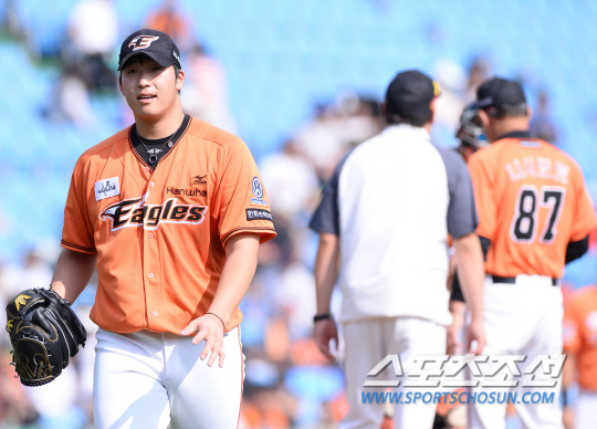 20일 대전 한화생명이글스파크에서 KBO리그 한화 이글스와 두산 베어스의 주말 2연전 두 번째 경기가 열렸다. 한화 김민우와 두산 니퍼트가 선발 맞대결을 펼쳤다. 3회 마운드를 내려오고 있는 김민우. 대전=송정헌 기자 songs@sportschosun.com/2015.09.20