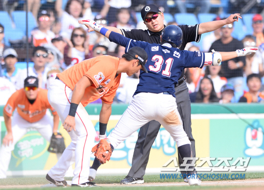 하지만 거기에 수비수는 없었다. 뒤늦게 한화의 외야진이 커버했지만, 1루 주자 김재호는 그대로 홈을 밟았다. 정수빈은 3루까지 갈 수 있었다.