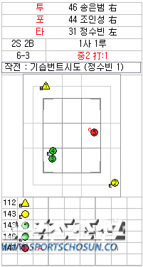 한화 송은범은 초구 112㎞ 커브를 던졌다. 바깥쪽으로 높게 형성된 '어림없는' 볼. 2구는 143㎞ 몸쪽 패스트볼 낮은 공. 타자의 시선을 안쪽으로 분산시키려고 하는 일종의 '미끼'였다.