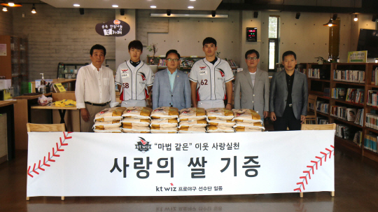 kt는 22일 추석을 맞이해 주변 어려운 이웃과 함께하고 수원 시민들의 성원에 보답하고자 사랑의 쌀 전달식을 진행했다. 구장 인근 주민센터를 통해 쌀을 기증했으며 송죽동 주민센터에 김재윤 정성곤, 조원1동 주민센터에 오정복 김사연, 조원2동 주민센터에 조무근 엄상백이 대표로 방문해 쌀을 전달했다. 총 3톤의 쌀이 수원 시민들에게 전해졌다. 이 쌀들은 주민센터를 통해 지역 내 홀몸 어르신들에게 전달될 예정이다.
