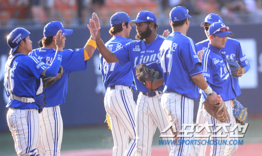 2015 KBO리그 넥센히어로즈와 삼성라이온즈의 경기가 13일 서울 목동야구장에서 열렸다.삼성 나바로가 팀의 7대 4 승리를 확정짓고 동료들과 하이파이브 하고있다. 목동=최문영 기자 deer@sportschosun.com
