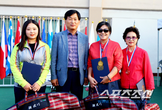 ◇김성수 국민생활체육 전국궁도연합회장 겸 세계민종국연맹 회장(왼쪽에서 두 번째)이 20일 청주 종합운동장에서 열린 제9회 세계민족궁대축전에서 여자부 금은동메달 리스트들과 기념촬영을 하고 있다. 사진제공=국민생활체육 전국궁도연합