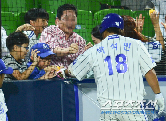 2015 프로야구 NC 다이노스와 삼성 라이온즈의 경기가 22일 대구구장에서 열렸다. 2회말 무사 삼성 박석민이 좌월 솔로포를 치고 들어와 관중석의 아이에게 자신이 차고 있던 손목 보호대를 주고 있다. 대구=정재근 기자 cjg@sportschosun.com
