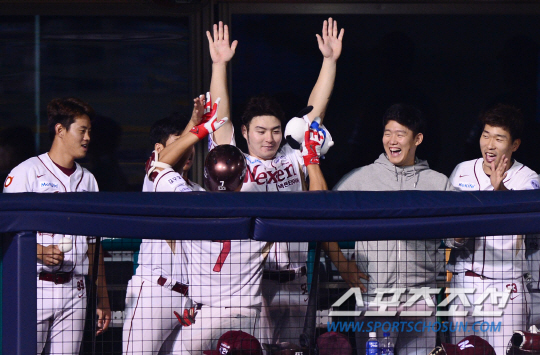 ◇박병호가 드디어 시즌 140타점을 넘어섰다. 한시즌 최다타점(이승엽, 2003년, 144타점) 경신을 눈앞에 두고 있다. 23일 SK전에서 3회말 2사 2루에서 팀 후배 김하성이 좌중월 투런 홈런을 치고 덕아웃에 들어오자 박병호가 익살스런 몸짓을 하고 있다. 목동=조병관기자 rainmaker@sportschosun.com/2015.09.23/