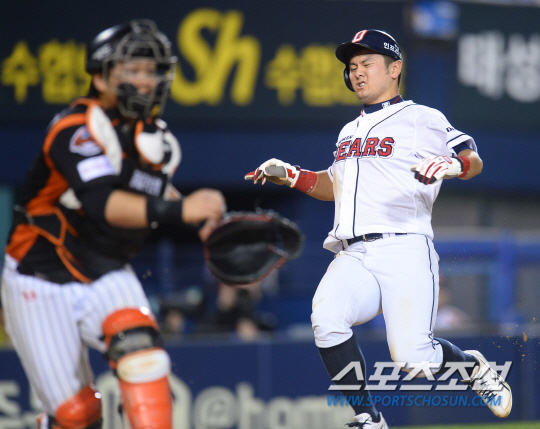 2015 KBO리그 두산 베어스와 롯데 자이언츠의 경기가 17일 서울 잠실야구장에서 열렸다. 두산 최주환이 6회말 2사 1,3루에서 정수빈의 3루타때 득점을 올리고 있다. 잠실=최문영 기자 deer@sportschosun.com /2015.09.17/