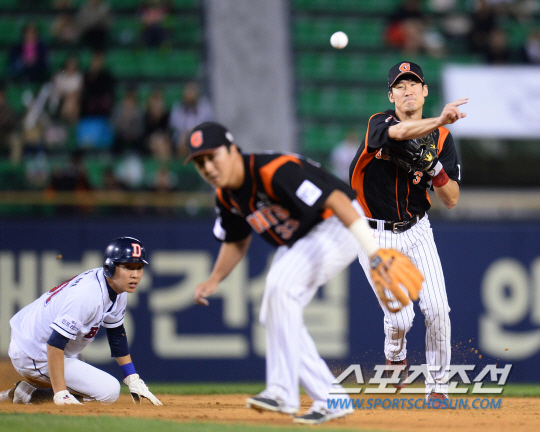 2015 KBO리그 두산 베어스와 롯데 자이언츠의 경기가 17일 서울 잠실야구장에서 열렸다. 두산 정수빈이 5회말 무사 1루에서 민병헌의 병살타때 2루에서 포스아웃되고 있다. 잠실=최문영 기자 deer@sportschosun.com /2015.09.17/