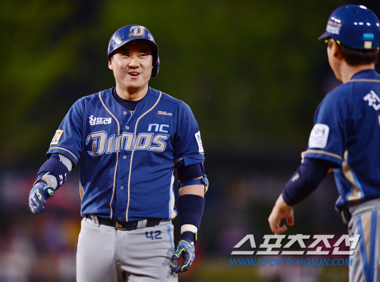 8일 오후 광주 기아챔피언스필드에서 2015 프로야구 NC와 KIA의 경기가 열렸다. 2회초 1사 2루서 1타점 적시타를 친 NC 김태군이 전준호 코치와 주먹을 맞추고 있다. 광주=김경민 기자 kyungmin@sportschosun.com / 2015.09.08.