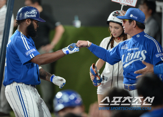 kt와 삼성의 2015 KBO 리그 경기가 24일 수원 kt위즈파크에서 열렸다. 6회초 무사 2루 삼성 나바로가 kt 홍성용의 투구를 받아쳐 중견수 뒤 담장을 넘어가는 동점 2점홈런을 날렸다. 홈인하며 류중일 감독과 하이파이브를 하는 나바로. 수원=허상욱 기자 wook@sportschosun.com/2015.09.24/