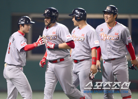 24일 서울 목동구장에서 KBO리그 넥센과 SK의 경기가 열렸다. 넥센 김상수와 SK 켈리가 선발 맞대결을 펼쳤다. SK 2회 무사 1, 2루에서 SK 브라운이 넥센 김상수를 상대로 3점 홈런을 날렸다. 홈에서 동료들과 하이파이브를 나누고 있는 브라운. 목동=송정헌 기자 songs@sportschosun.com/2015.09.24 |