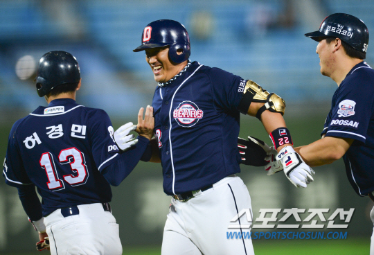 2015 프로야구 두산 베어스와 롯데 자이언츠의 더블헤더 2차전 경기가 24일 부산구장에서 열렸다. 7회초 2사 만루 두산 홍성흔이 좌중월 만루홈런을 치고 들어오며 선행주자들의 축하를 받고 있다. 두산 선발투수로 시즌성적 4승 5패 방어율 5.18의 스와잭을 내세웠다. 롯데에서는 1패 방어율 5.59의 배장호가 선발 등판했다. 부산=정재근 기자 cjg@sportschosun.com/2015.09.24/
