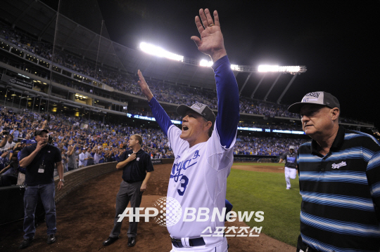캔자스시티 로열스 네드 요스트 감독이 25일(한국시각) 시애틀 매리너스전에서 승리한 뒤 지구우승 확정을 축하하는 홈팬들을 향해 손을 들어 답례하고 있다. ⓒAFPBBNews = News1