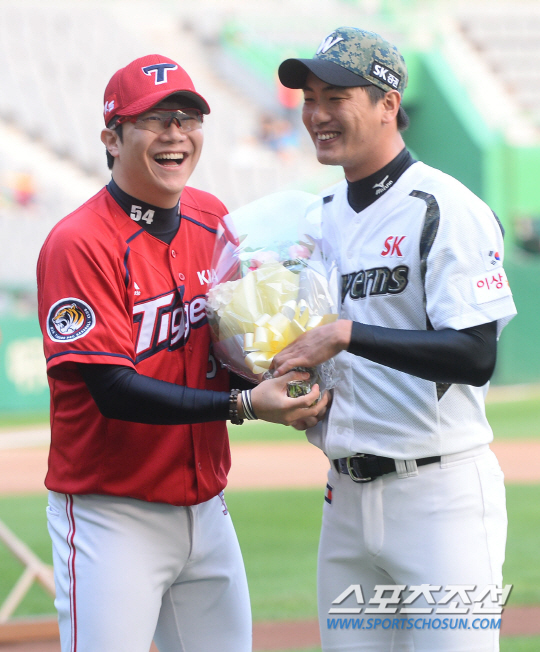 2015 KBO리그 SK와이번즈와 KIA타이거즈의 경기가 21일 인천SK행복드림구장에서 열렸다. 경기전 SK 김광현이 '프로통산 1,000탈삼진 달성'을 기념하는 축하꽃다발을 KIA 양현종으로 부터 전달받고 있다. 문학=최문영 기자 deer@sportschosun.com /2015.09.21/ |