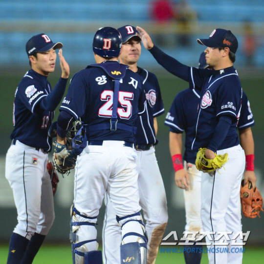 2015 프로야구 두산 베어스와 롯데 자이언츠의 더블헤더 2차전 경기가 24일 부산구장에서 열렸다. 10-6으로 승리를 거두며 1, 2차전을 모두 이긴 두산 선수들이 하이파이브를 하고 있다. 두산 선발투수로 시즌성적 4승 5패 방어율 5.18의 스와잭을 내세웠다. 롯데에서는 1패 방어율 5.59의 배장호가 선발 등판했다. 부산=정재근 기자 cjg@sportschosun.com/2015.09.24/