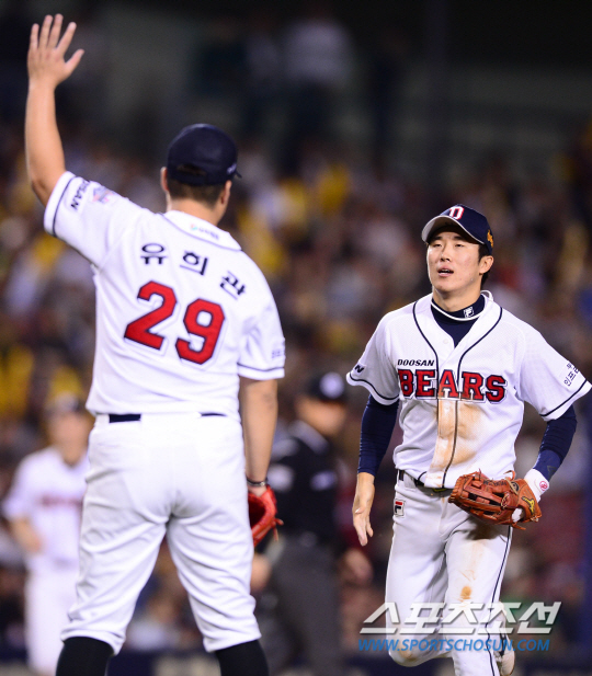 2015 프로야구 두산과 KIA의 경기가 10일 잠실 야구장에서 펼쳐 졌다. 6회초 2사 2루 실점 위기에서 KIA 나지완의 안타성 타구를 다이빙 캐치로 잡아낸 허경민이 유희관과 하이파이브를 하고 있다. 잠실=조병관기자 rainmaker@sportschosun.com