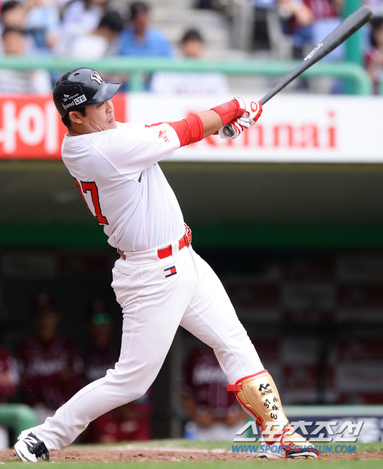 28일 인천 SK행복드림구장에서 KBO리그 SK 와이번스와 넥센 히어로즈의 경기가 열렸다. SK 3회 정의윤, 브라운, 박정권이 넥센 김대우를 상대로 세 타자 연속 홈런을 기록했다. 힘찬 타격으로 홈런을 만들어내고 있는 정의윤. 인천=송정헌 기자 songs@sportschosun.com/2015.09.28