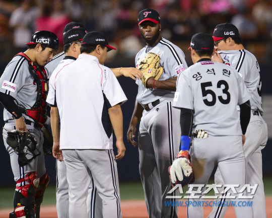 2015 프로야구 LG 트윈스와 넥센 히어로즈의 경기가 16일 목동구장에서 열렸다. 8회말 2사 1루 넥센 김하성의 유격수앞 땅볼 때 LG 1루수 양석환이 실책으로 공을 놓치며 1, 3루가 되자 양상문 감독이 올라가 선수들을 모아놓고 이야기를 하고 있다. LG는 선발투수로 시즌성적 7승 9패 방어율 3.92의 우규민을 내세웠다. 넥센에서는 1패 방어율 8.31의 오재영이 선발 등판했다. 정재근 기자 cjg@sportschosun.com