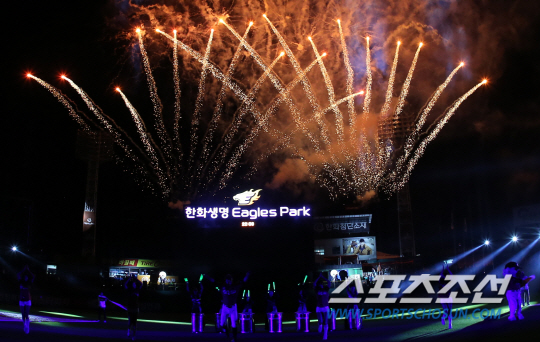 ◇한화 이글스의 홈구장인 대전 한화생명 이글스파크에서 지난 9월30일 홈 최종전이 끝난 뒤 화려한 폭죽쇼가 펼쳐지고 있다. 올 시즌 성원해 준 홈팬들에 대한 선물로 한화가 마련한 이벤트다. 사진=한화 이글스 제공