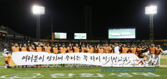 ◇한화 이글스 선수단이 9월30일 대전 한화생명 이글스파크에서 삼성 라이온즈를 18대6으로 꺾으며 2015시즌 홈경기 일정을 마감했다. 이날 승리로 한화는 무려 7년 만에 최고 홈승률을 달성했다. 한화 선수단은 홈팬들에게 변함없는 선전을 약속했다. 사진=한화 이글스 제공