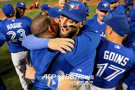 메이저리그 토론토 블루제이스가 기적같은 '역주행 지구우승'을 달성했다. 지난 1993년 이후 22년 만의 지구 우승이다. 토론토는 2개월 여전까지만 해도 1위 뉴욕 양키스에 7경기차로 뒤진 지구 4위였다. 그러나 이후 56경기에서 7할5푼의 승률을 거두며 승승장구했다. 1일(한국시각) 미국 볼티모어 캠든야드에서 열린 볼티모어 오리올스와의 원정 더블헤더 1차전에서 15대2로 승리하며 자력 우승을 차지한 토론토 선수들이 포옹을 하며 우승의 감격을 맛보고 있다. ⓒAFPBBNews = News1