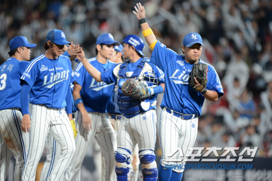 kt와 삼성의 2015 KBO 리그 경기가 24일 수원 kt위즈파크에서 열렸다. 삼성이 5대2로 승리하며 6연승을 달렸다. 경기를 마무리한 삼성 선수들이 기쁨을 나누고 있다. 수원=허상욱 기자 wook@sportschosun.com/2015.09.24/ |