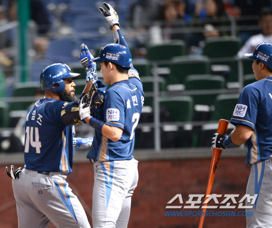 2일 인천 SK행복드림구장에서 KBO리그 SK 와이번스와 NC 다이노스의 경기가 열렸다. SK 문광은과 NC 이태양이 선발 맞대결을 펼쳤다. NC 테임즈가 1회 1사 1,2루에서 SK 문광은을 상대로 시즌 47호 선제 3점홈런을 날렸다. 덕아웃에서 동료들과 하이파이브를 나누고 있는 테임즈. 인천송정헌 기자 songs@sportschosun.com