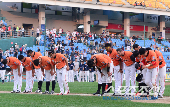 20일 대전 한화생명이글스파크에서 KBO리그 한화 이글스와 두산 베어스의 주말 2연전 두 번째 경기가 열렸다. 두산이 한화에 16대4로 승리했다. 경기 종료 후 팬들에게 인사를 하고 있는 한화 선수들. 대전=송정헌 기자 songs@sportschosun.com