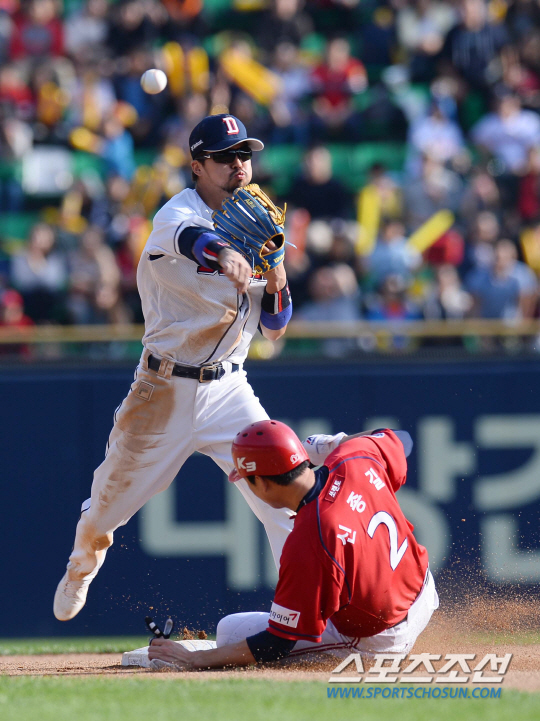 | 2015 KBO리그 두산베어스와 KIA타이거즈의 경기가 4일 서울잠실야구장에서 열렸다. KIA 6회초 1사 1루에서 김원섭의 내땅때 1루주주자 신종길이 2루에서 포스아웃되고 있다. 잠실=최문영 기자 deer@sportschosun.com /2015.10.04/ |