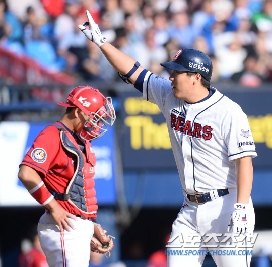 | 2015 KBO리그 두산베어스와 KIA타이거즈의 경기가 4일 서울잠실야구장에서 열렸다. 두산 김현수가 6회말 1사 1,2루에서 우월 3점홈런을 치고 동료들의 환영을 받고있다. 잠실=최문영 기자 deer@sportschosun.com /2015.10.04/ |