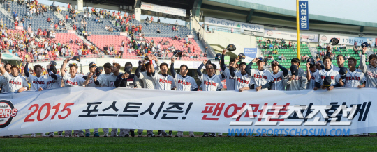 2015 KBO리그 두산베어스와 KIA타이거즈의 경기가 4일 서울잠실야구장에서 열렸다. 두산이 KIA를 상대로 9대0으로 승리해 포스트시즌 3위 진출을 확정 지은후 관중들을 향해 답례하고 있다 잠실=최문영 기자 deer@sportschosun.com /2015.10.04/