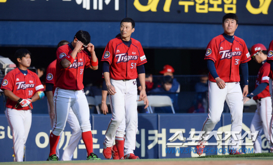 2015 KBO리그 두산베어스와 KIA타이거즈의 경기가 4일 서울잠실야구장에서 열렸다. KIA 선수들이 두산을 상대로 0대9로 패하며 포스트시즌 진출이 좌절됐다. 경기를 마친 KIA 선수들이 경기장에 도열하고 있다. 잠실=최문영 기자 deer@sportschosun.com /2015.10.04/