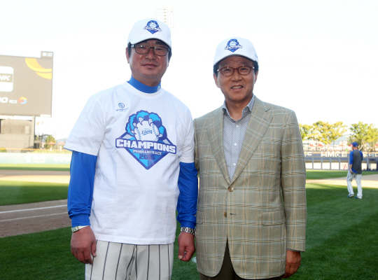 류중일 삼성 라이온즈 감독과 김 인 구단 사장이 5일 광주 기아챔피언스필드에서 페넌트레이스 5년 연속 우승 기념 촬영을 한 뒤 함께 자리했다. 사진제공=삼성 라이온즈
