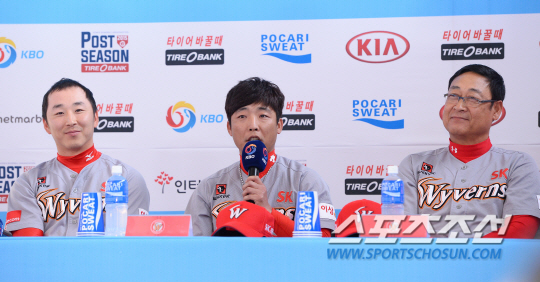 6일 목동구장에서 와일드카드 결정전 미디에데이가 열렸다. 7일부터 넥센과 SK는 2015 KBO 포스트시즌(PS) 와일드카드 결정전을 펼친다. 포스트시즌 사상 처음 열리는 와일드카드 결정전은 정규리그 4위 넥센과 5위 SK의 경기로 최대 2경기까지 치른다. 넥센은 1무승부 이상 기록하면 준PO에 진출하고 SK는 2승을 기록해야 준PO 진출이 가능하다. 미디어데이에 참석한 SK 김용희 감독과 정우람, 조동화 선수가 질문에 답하고 있다. 목동=송정헌 기자 songs@sportschosun.com/2015.10.06
