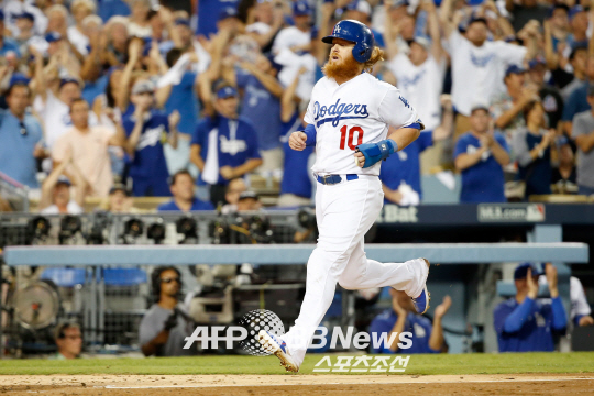 | LA 다저스 저스틴 터너가 11일(한국시각) 뉴욕 메츠와의 디비전시리즈 2차전서 4회말 안드레 이디어의 2루타 때 홈을 밟고 있다. ⓒAFPBBNews = News1 |