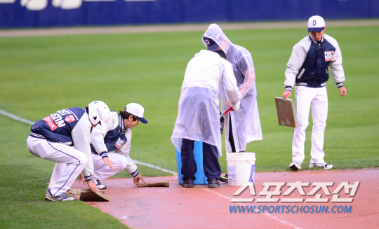 다행히, 오후 5시 3분겨이 비가 잠잠해졌다. 경기 속개를 위해 그라운드 정비를 시작했다. 이날 2차전은 경기 중단 딱 32분 후인 오후 5시 17분 재개됐다. 잠실=류동혁 기자 sfryu@sportschosun.com
