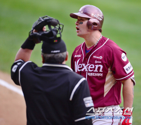 11일 오후 서울 잠실야구장에서 2015 프로야구 준플레이오프 2차전 넥센과 두산의 경기가 열렸다. 6회초 1사서 넥센 박병호가 삼진 아웃된 후 전일수 주심에게 항의하고 있다. 잠실=김경민 기자 kyungmin@sportschosun.com / 2015.10.11. |