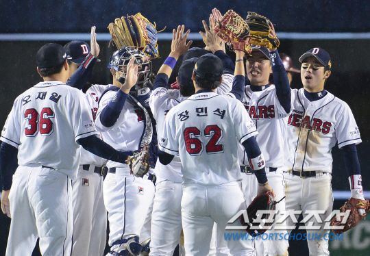 | 2015 프로야구 준플레이오프 2차전 넥센 히어로즈와 두산 베어스의 경기가 11일 잠실구장에서 열렸다. 두산이 3-2의 승리를 거둔 가운데 선수들이 환호하고 있다. 넥센은 벼랑끝에 몰렸다. 잠실=정재근 기자 cjg@sportschosun.com/2015.10.11/ |