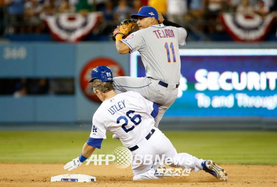 다저스 어틀리가 슬라이딩 과정에서 뉴욕 메츠 테하다와 충돌하고 있다. ⓒAFPBBNews = News1
