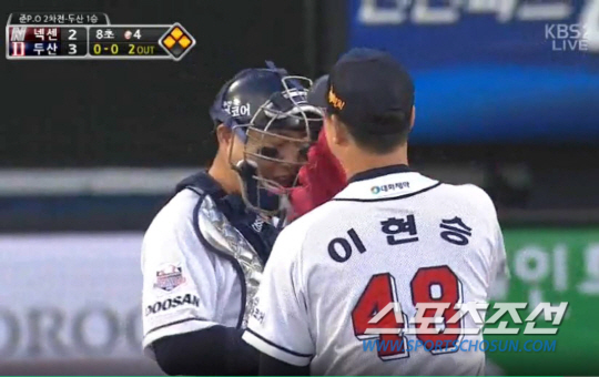 유한준을 어떻게 상대할까 얘기하는줄 알았더니 중계화면에 양의지가 갑자기 씩 웃으면서 말하고 곧바로 이현승이 웃으며 글러브로 양의지의 마스크를 때리는 장면이 나왔다. 분명 양의지가 이현승을 놀리는 농담을 한 것처럼 보였다. 이런 큰 위기에서 농담을 하는게 쉽지 않을 것 같은데 둘은 그렇게 웃으며 헤어졌고, 이현승은 유한준을 4구만에 우익수 플라이로 처리하며 가장 큰 위기를 넘겼다. 9회에도 마운드에 오른 이현승은 김민성과 윤석민을 삼진으로 돌려세우고 김하성을 유격수앞 땅볼로 처리하며 경기 끝.